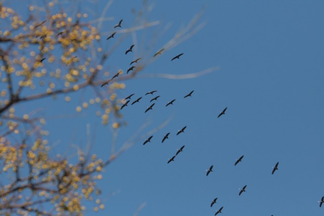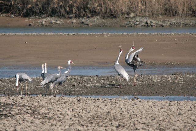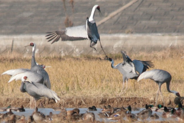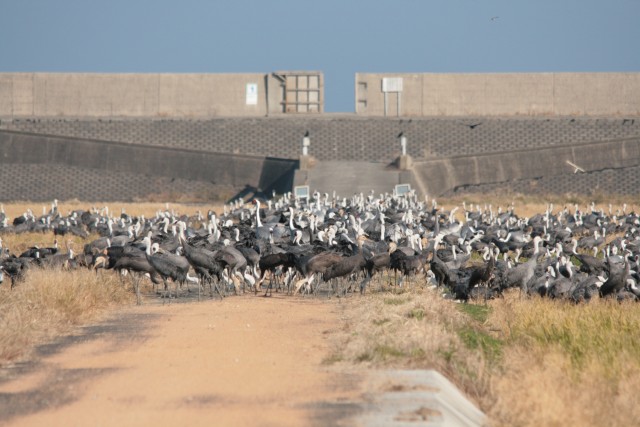東干拓に避難?してきたツルたち。監視所前もいつになく大盛況でした。クロヅルもカナダヅルも一緒に見られましたよ。