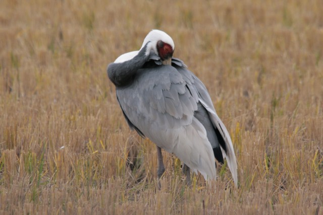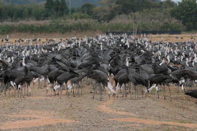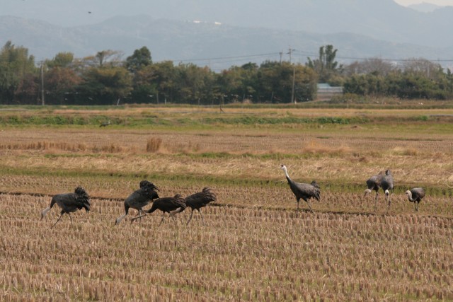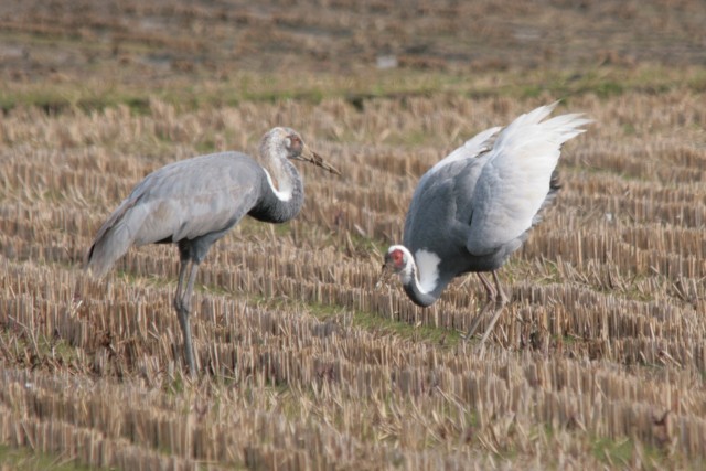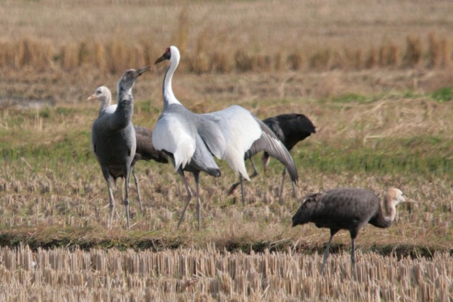 ケンカに負けたナベヅル家族は、首を下げて退散。