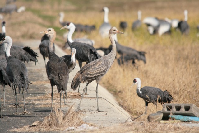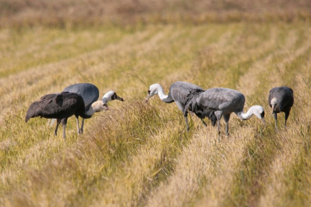 マナヅルもナベヅル一家に混じって、同じ釜の飯を食うというか・・・同じ株の米を食う。