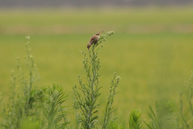 田んぼの実った穂の先に、たくさんのカワラヒワ。