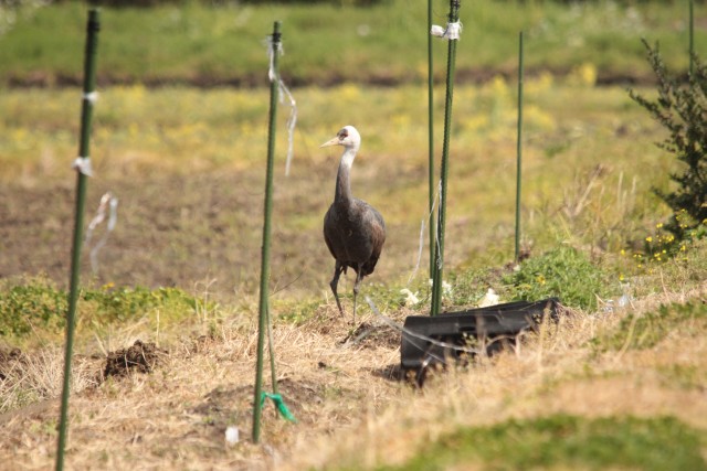 古浜にいる足が折れたナベヅル幼鳥。