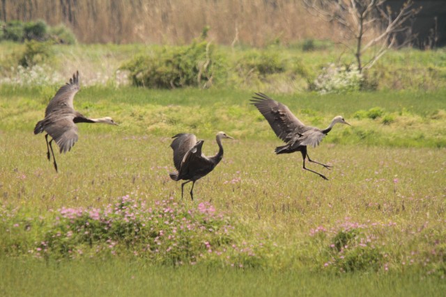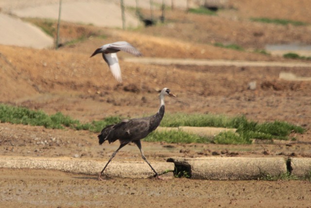 あわてて、逃げ出すナベヅル1羽。