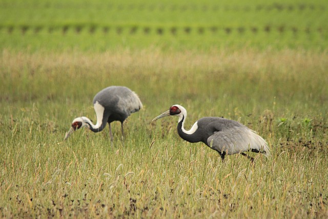 荒崎の水源地近くの田んぼにマナヅル2羽精力的に採餌。