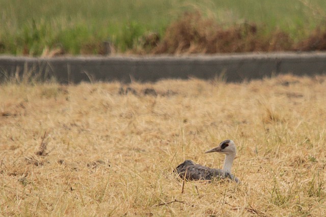 下水流のナベヅルは、草刈り取り後の田んぼに座り込み。風が来ないようにか、縦横のあぜに近い場所。