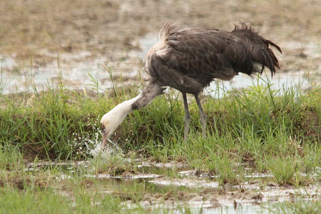 ナベヅルは水たまりで顔を洗う。