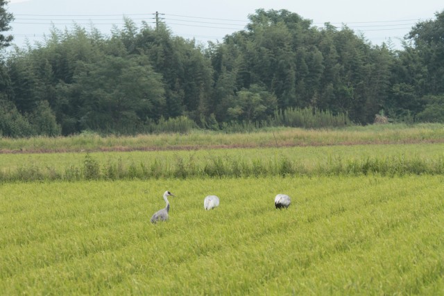 荒崎観察センター前の奥の方、昨日より東側の田に、マナヅル2ナベヅル1そろって採餌中。