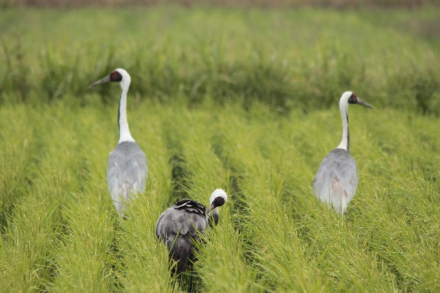 マナヅルは警戒しても、ナベヅルは羽づくろい続行。