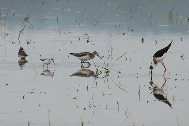 荒崎の田んぼに、セイタカシギが3羽、アオアシシギ2羽、コアオアシシギが2羽。
