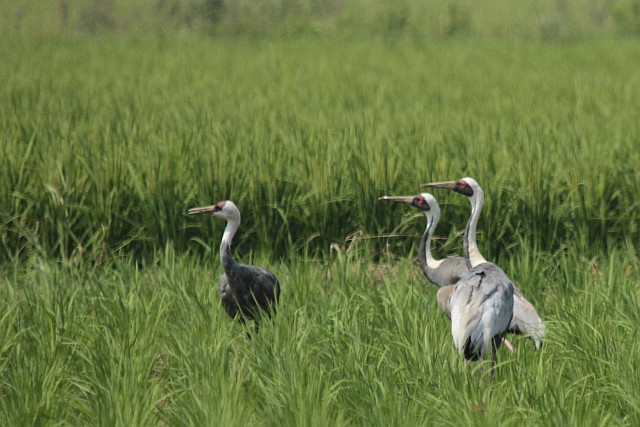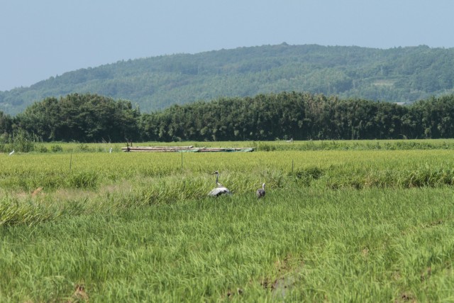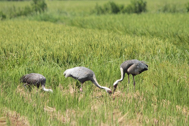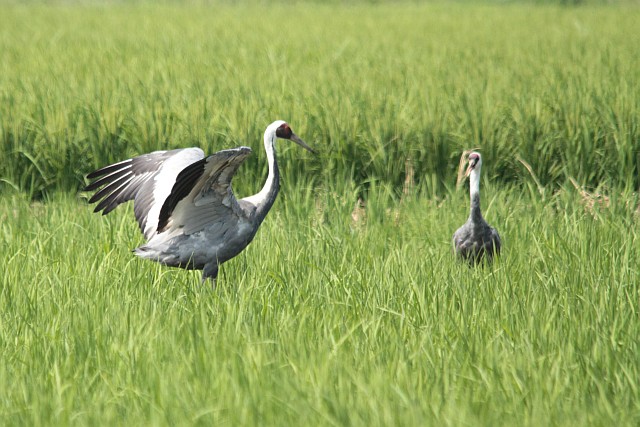 少しの間、羽ばたきながら歩き回るナベヅル。