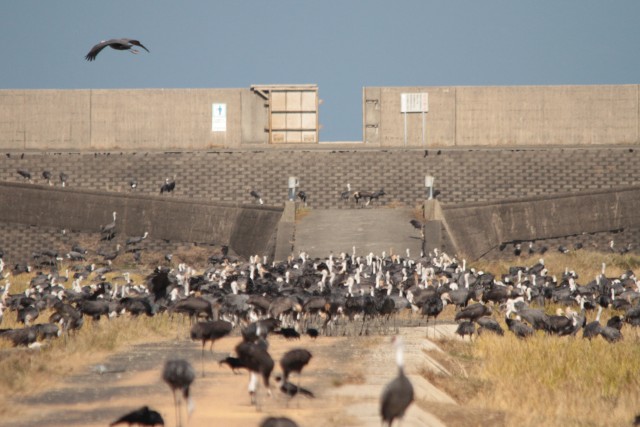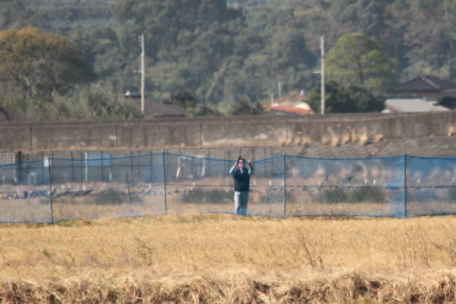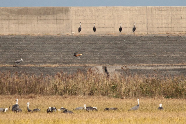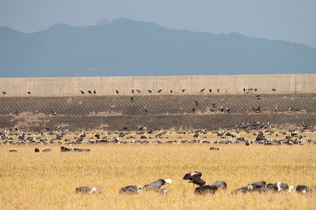 ツルが大勢で飛び上がったと思ったら、また!立ち入り禁止区域の入り込み。看板に書いてある文字が読めないのでしょうか?みんなみんな監視所から丸見えです。