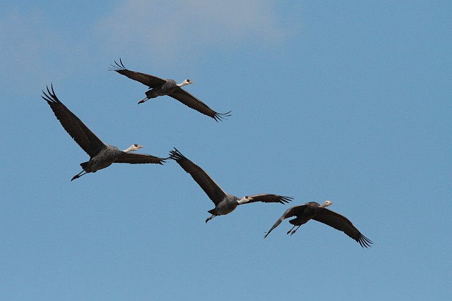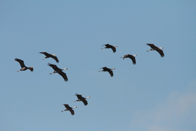 おびえて飛ぶツルたちは、カメラマンからはおしりしか写りませんよ?