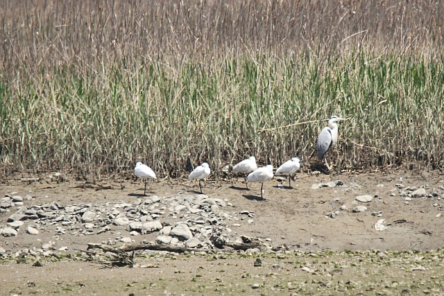 高尾野川の中州にヘラサギ1羽にクロツラヘラサギが4羽