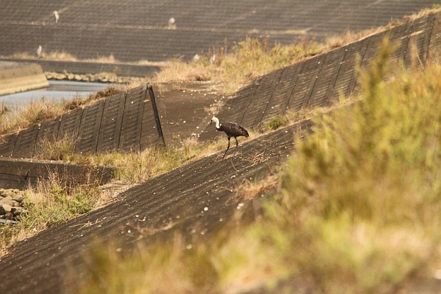羽の悪いナベヅル、堤防の一番上に乗っています