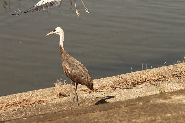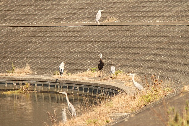 東干拓保護区内の堤防水路際にアオサギたちと一緒に過ごす、骨の悪いナベヅル