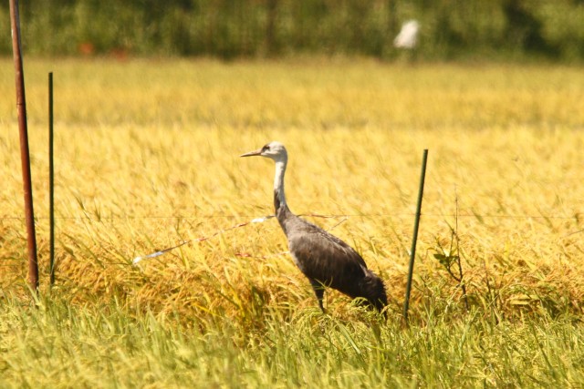 羽の抜けたナベヅルは、稲穂が実っている田んぼの隣にまだ水が張ってある成長しつつある稲の田んぼがある場所で過ごしている