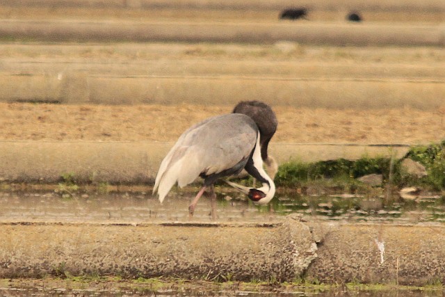 足が悪いマナヅル成鳥?は、道路の東側に群れとはちょっと離れてナベヅル幼鳥と一緒に羽づくろい