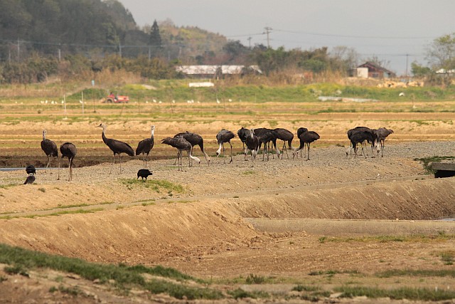 ツルが居る一本西の道路を消防車が通ると飛ぶ