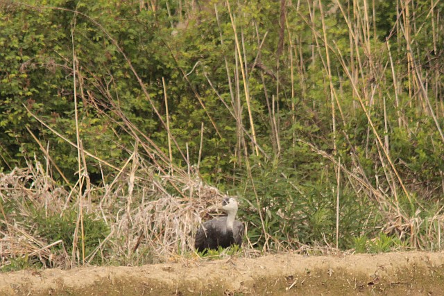 こっそり隠れる離れたところにいるナベヅル幼鳥1羽