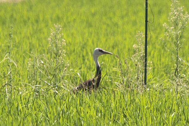 田んぼの畦で羽づくろいしてる居残りナベヅル
