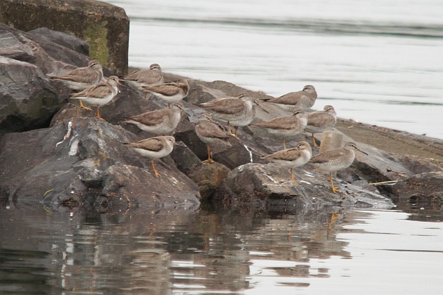 背中にクチバシ突っ込んでくつろいでたからすっかり全部キアシシギと思ってたら、ソリハシシギが混じってたか!?