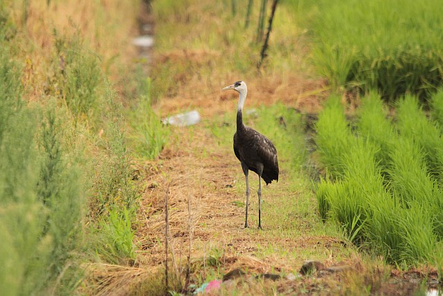 アオサギやトビが飛んで行くのを見てる居残りナベヅル