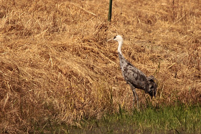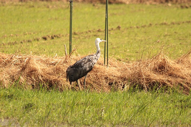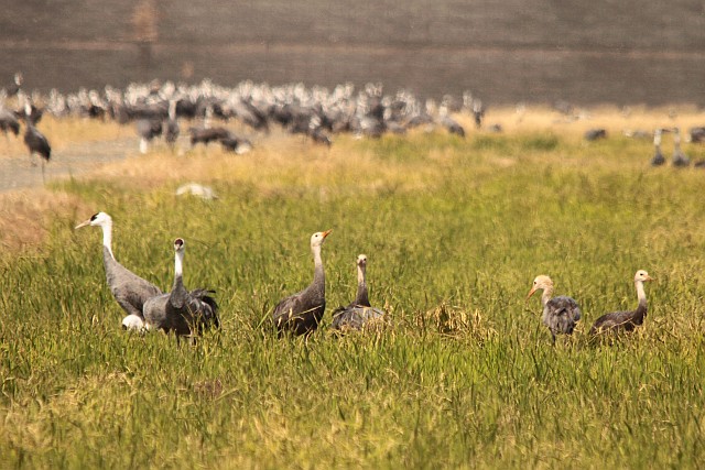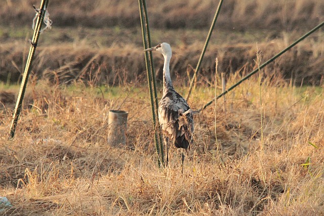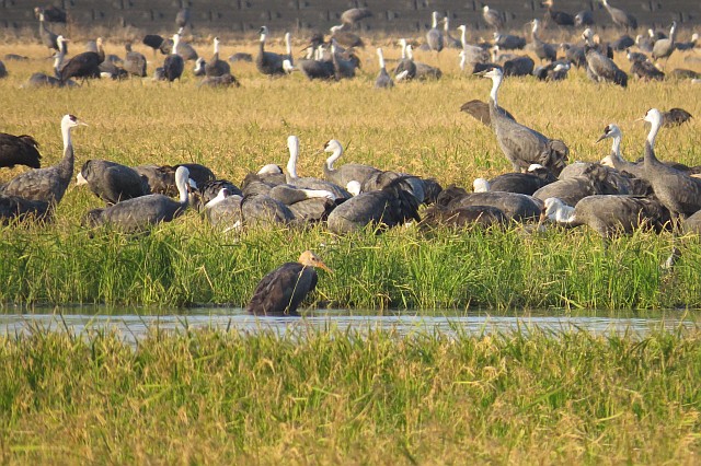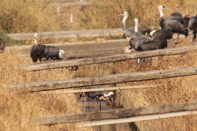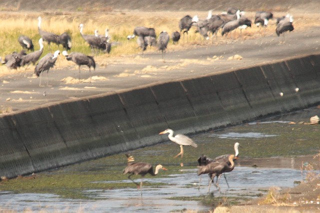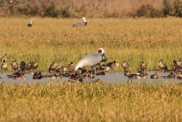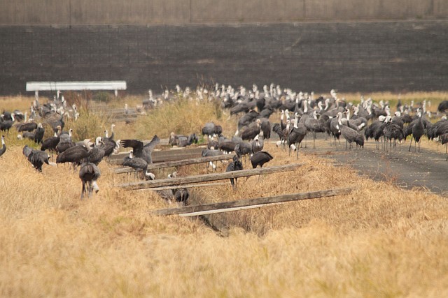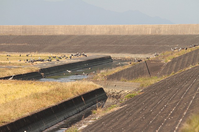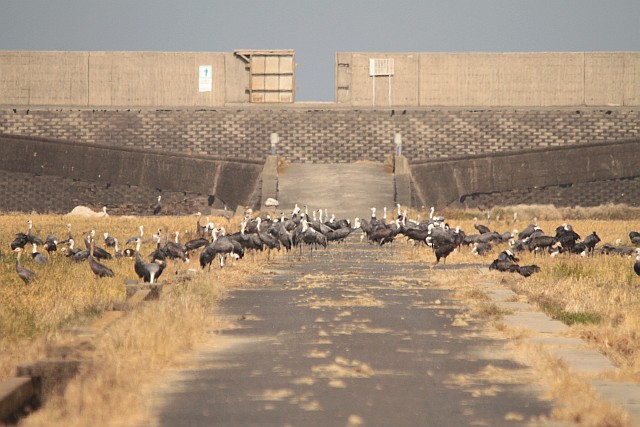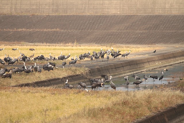 堤防際の水路には昨日よりも多くのナベヅルが入っていた