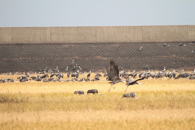 12時前、保護区に隣接する立ち入り禁止の区域に人が入り、堤防際のツルたちが一斉に飛んだ