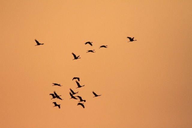 ツルはまだ出水に来たばかりで、警戒する範囲も広いです