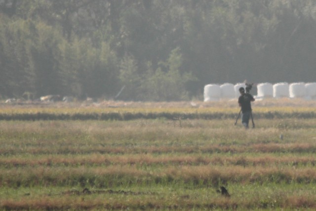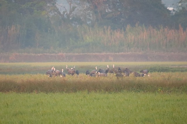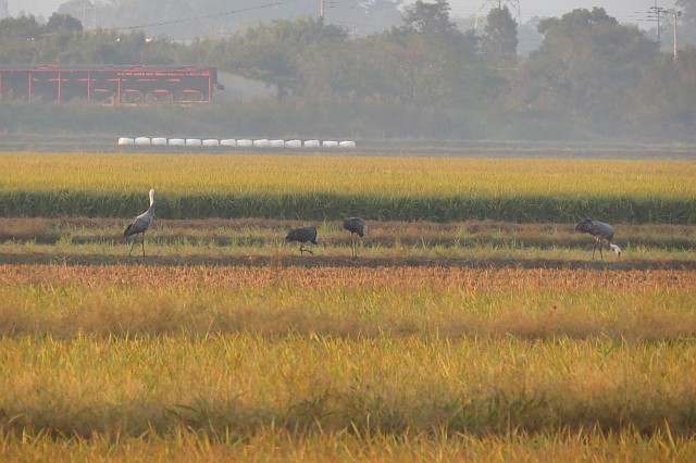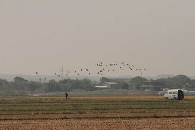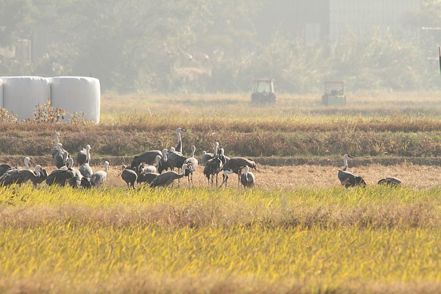 夜~朝にかけてきたばかりのツルたちは、保護区外に降りてた模様