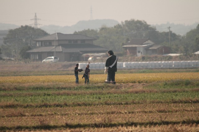 東干拓の保護区外のナベヅルの群れに歩いていく・・・