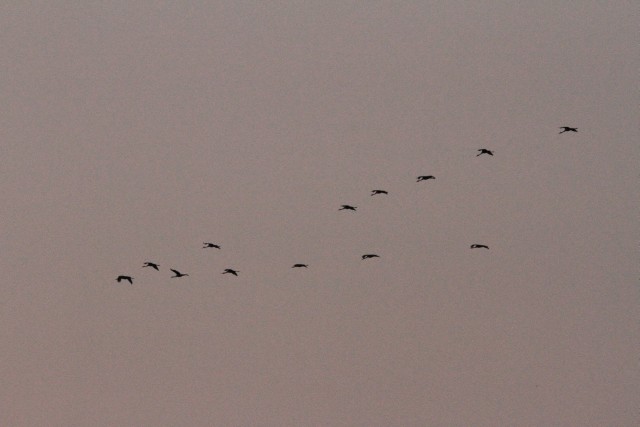 暗くなって、ねぐらを探して荒崎に飛んでいくツルの群れ