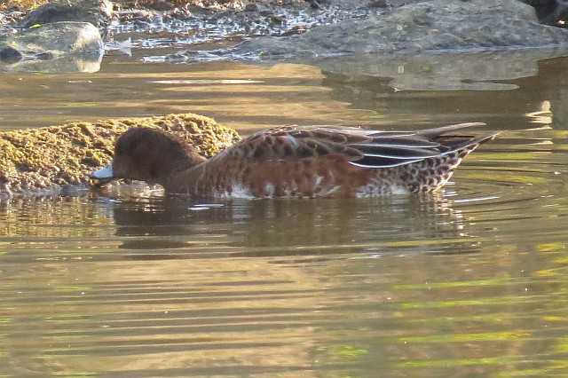 岩についたノリのようなものを食べるヒドリガモ