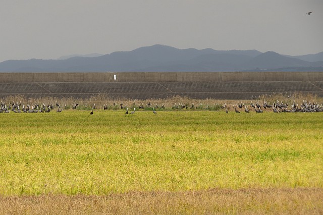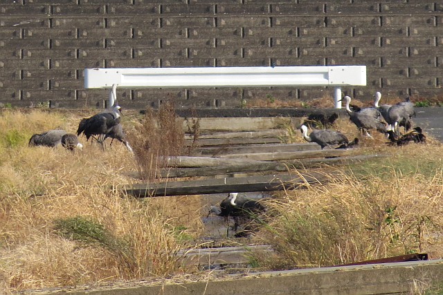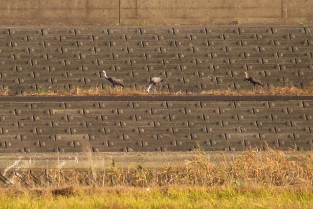 今年初めて、堤防に上がるツルたち